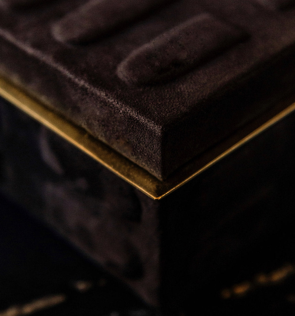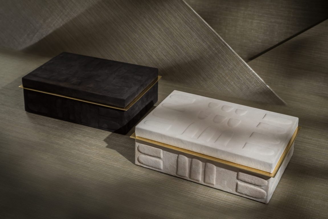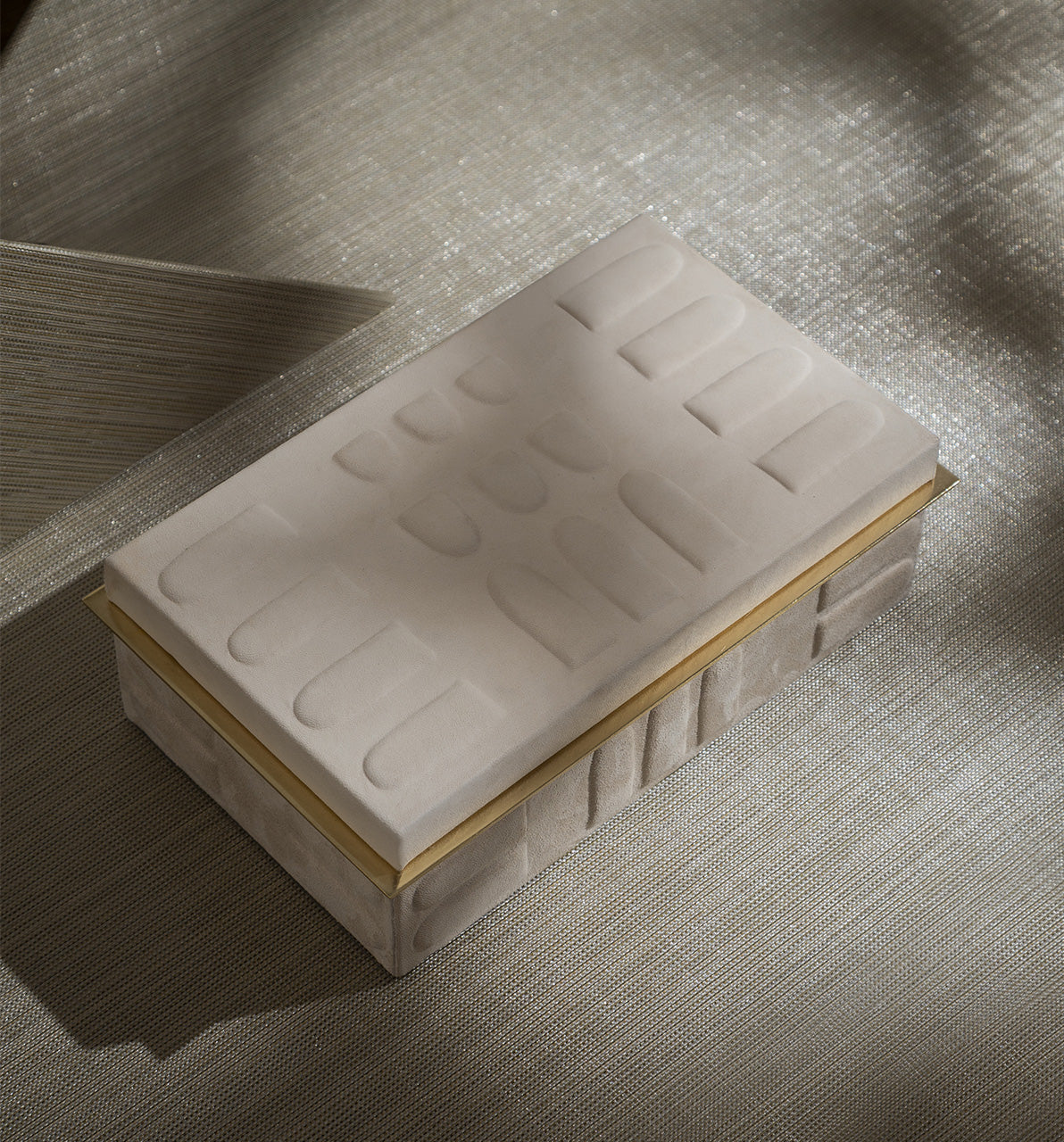 The linear and minimalist brass insert counterbalances the sumptuousness of the piece, for an elegant an refined look.
