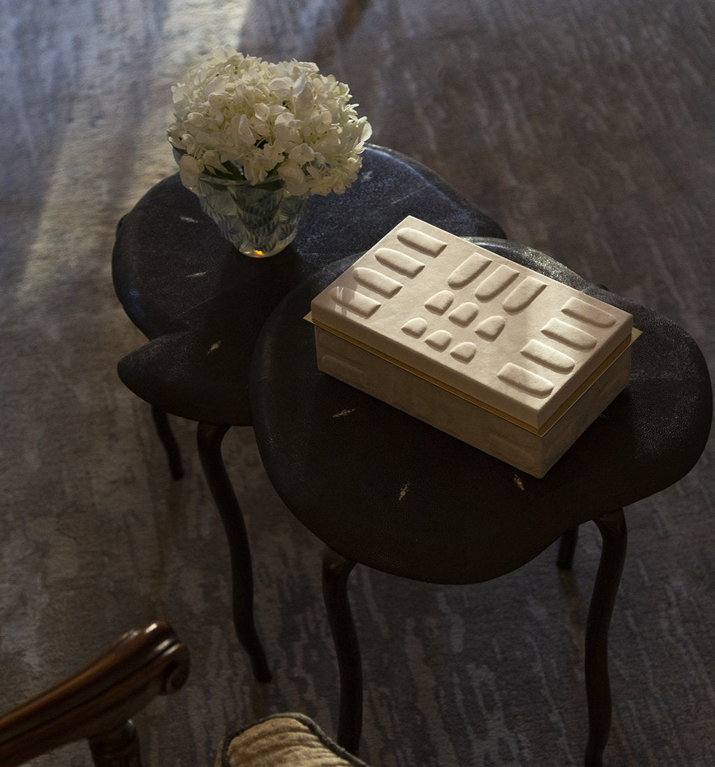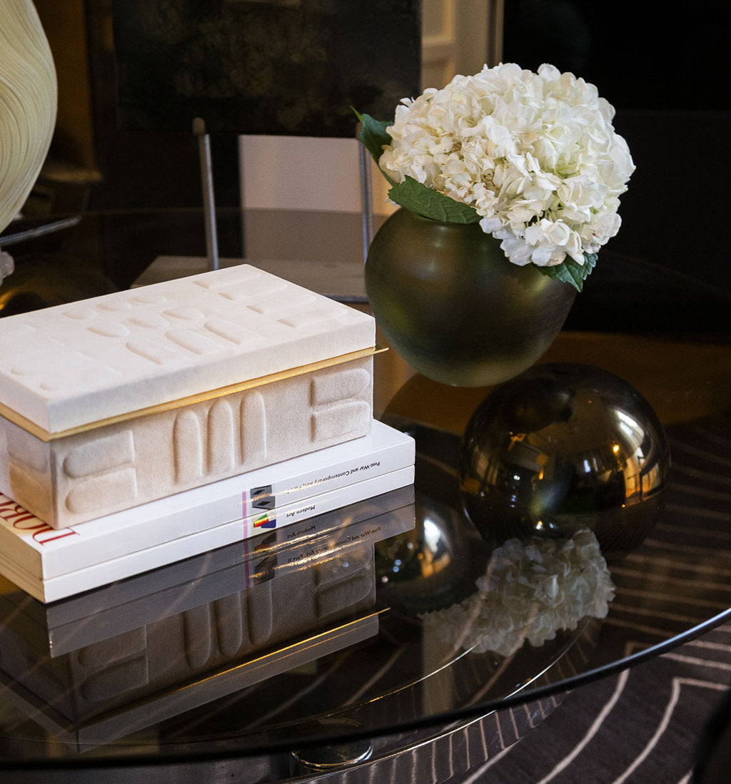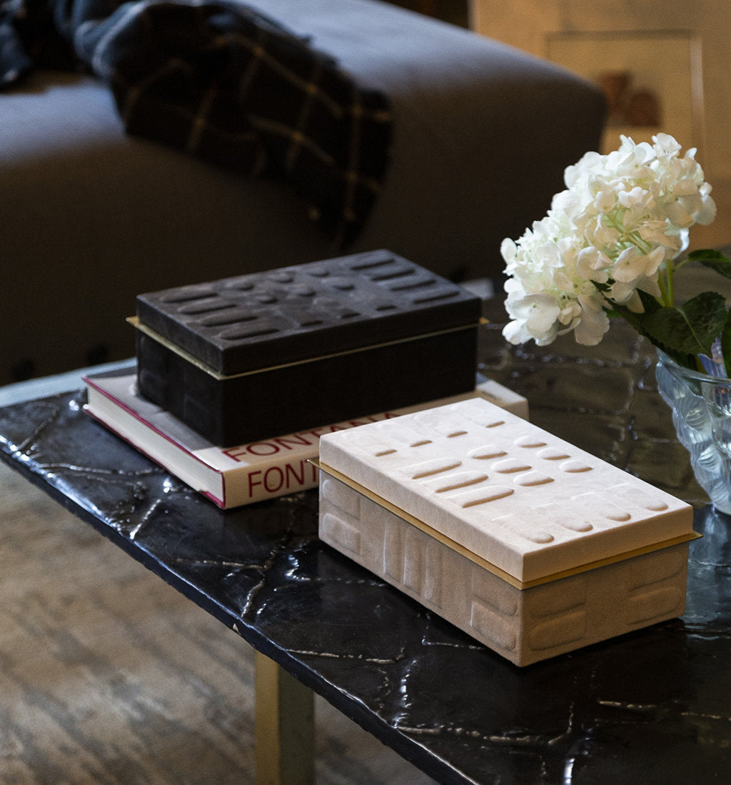 The linear and minimalist brass insert counterbalances the sumptuousness of the piece, for an elegant an refined look.