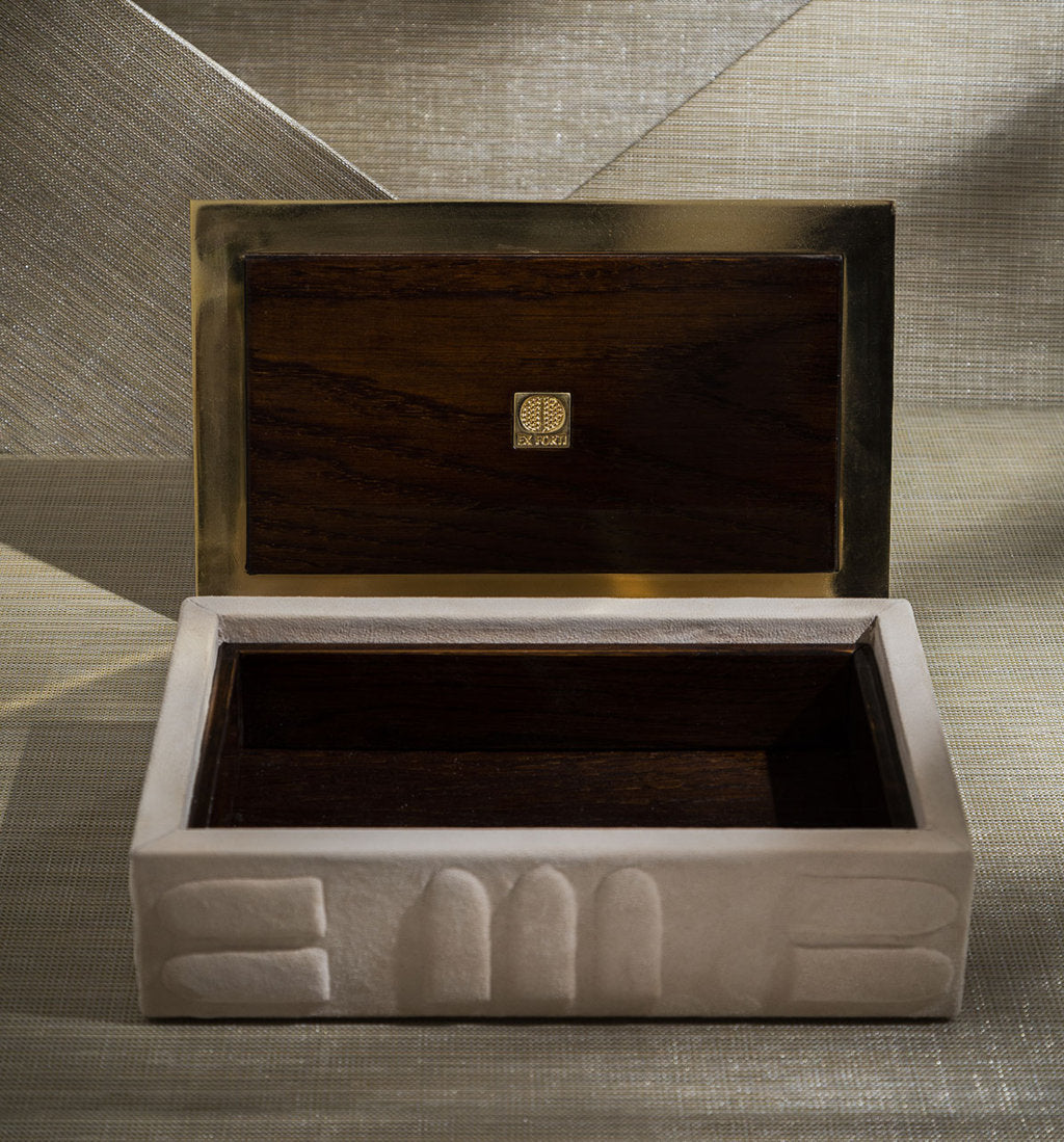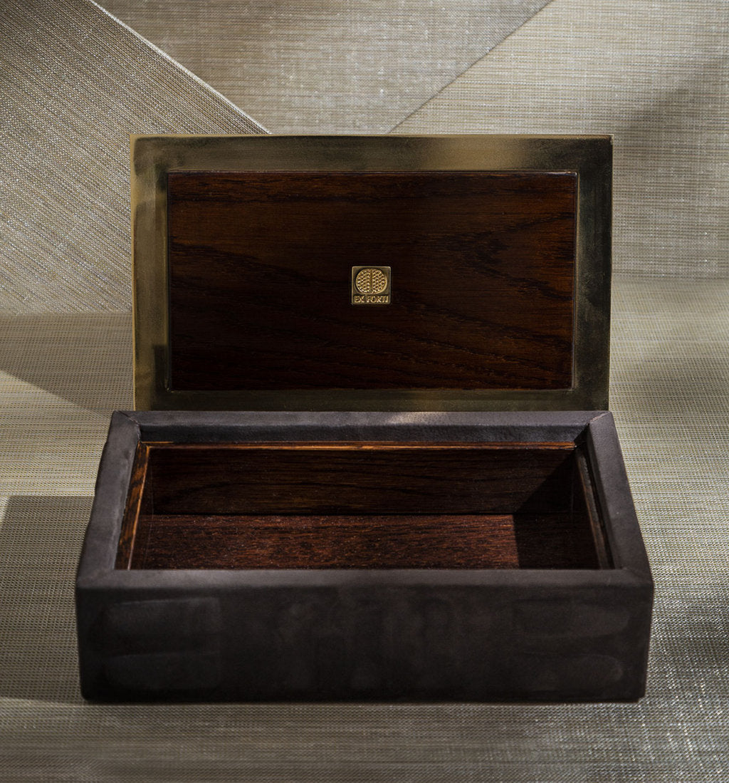 The solid Canaletto walnut structure of the body an th lid is Covered in a prized an highly textured Nubuck Leather Enhancing the visual effect of the piece, soft to the touch and vibrant to the eye.