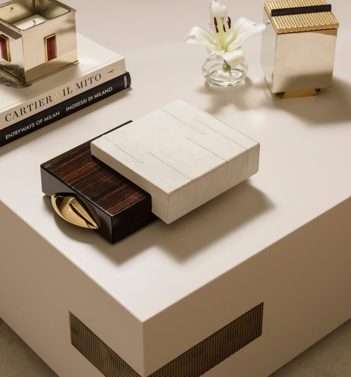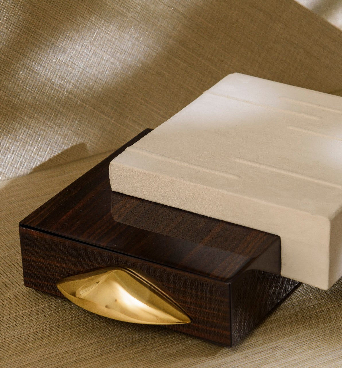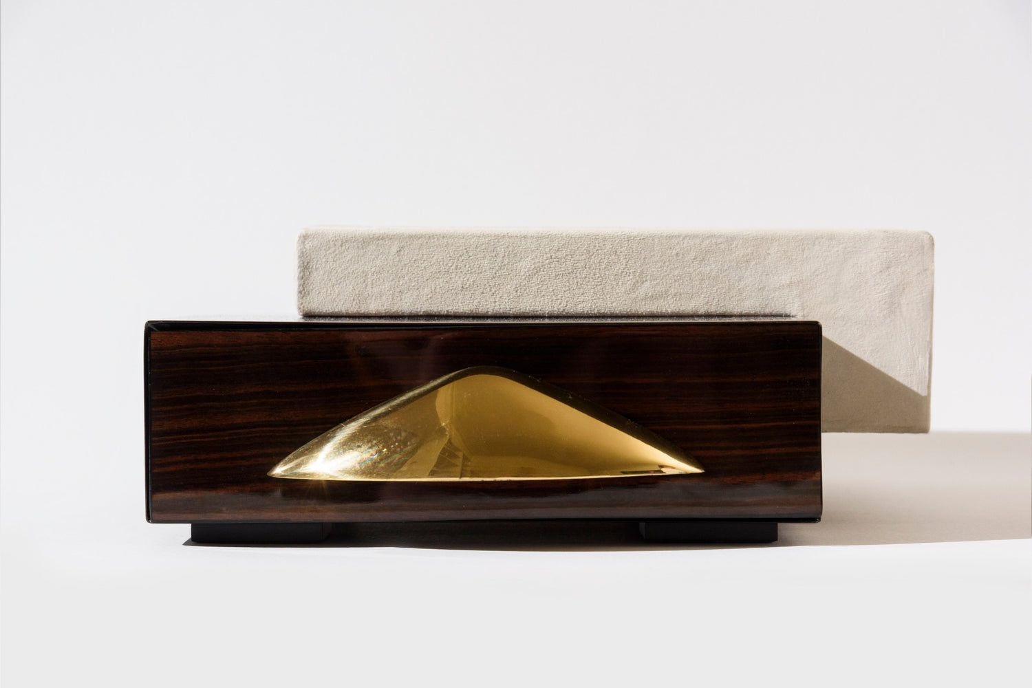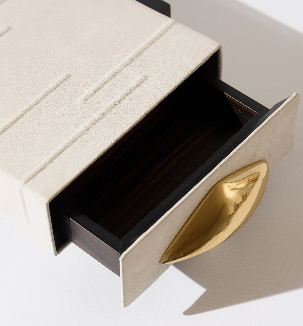 Its two drawers, seamlessly integrated into the sculptural design, offer refined functionality, while the two brass handles add a note of understated brilliance — a subtle accent that completes the composition with balance and poise.