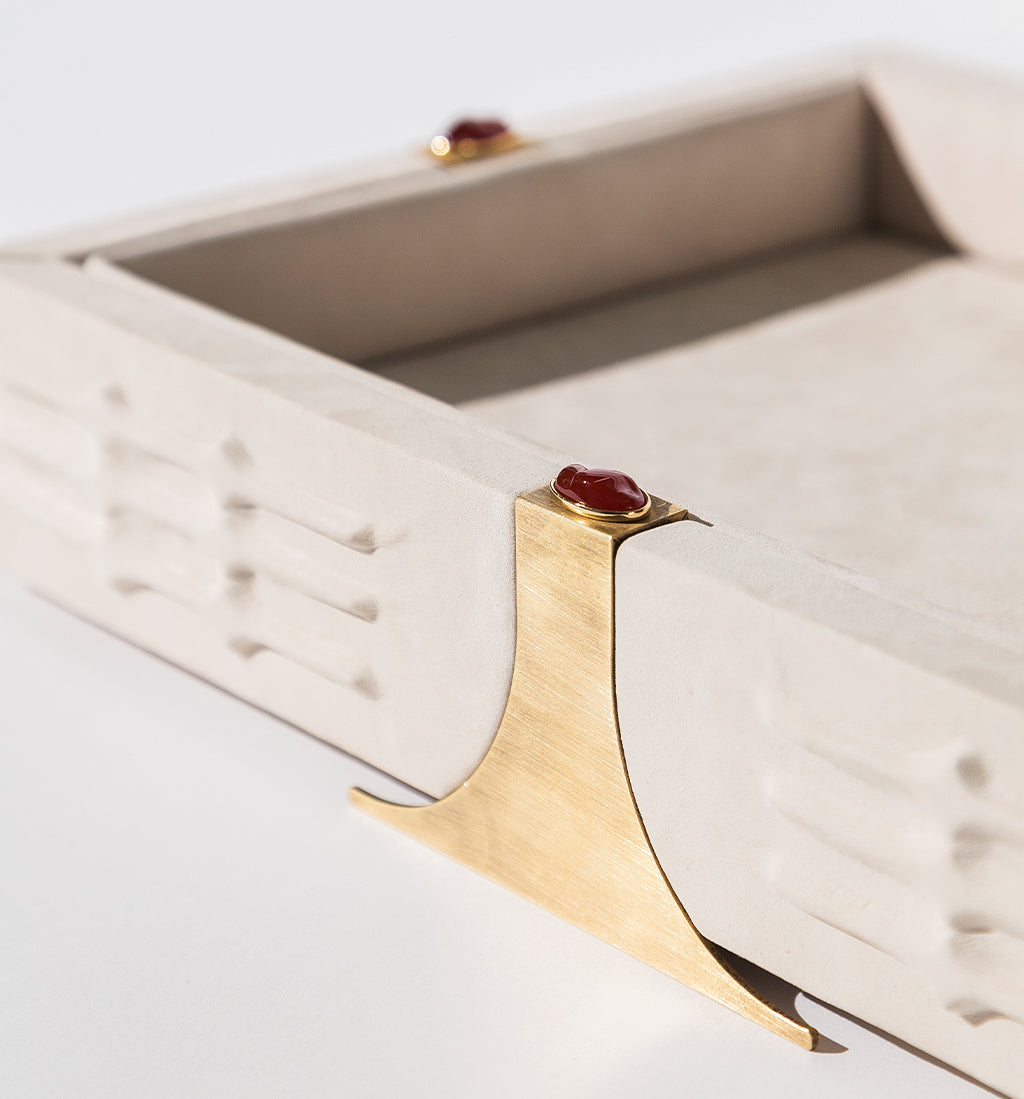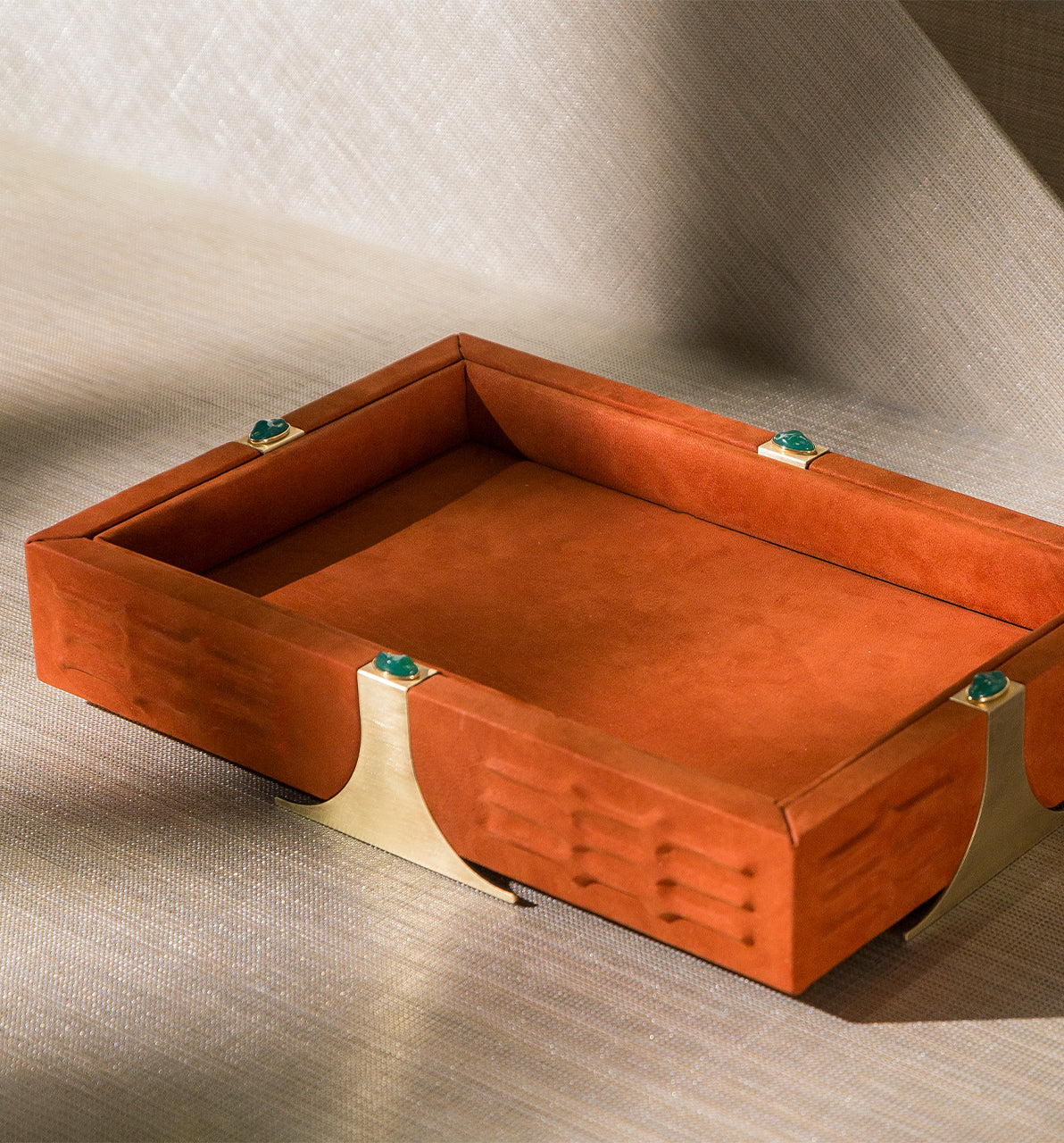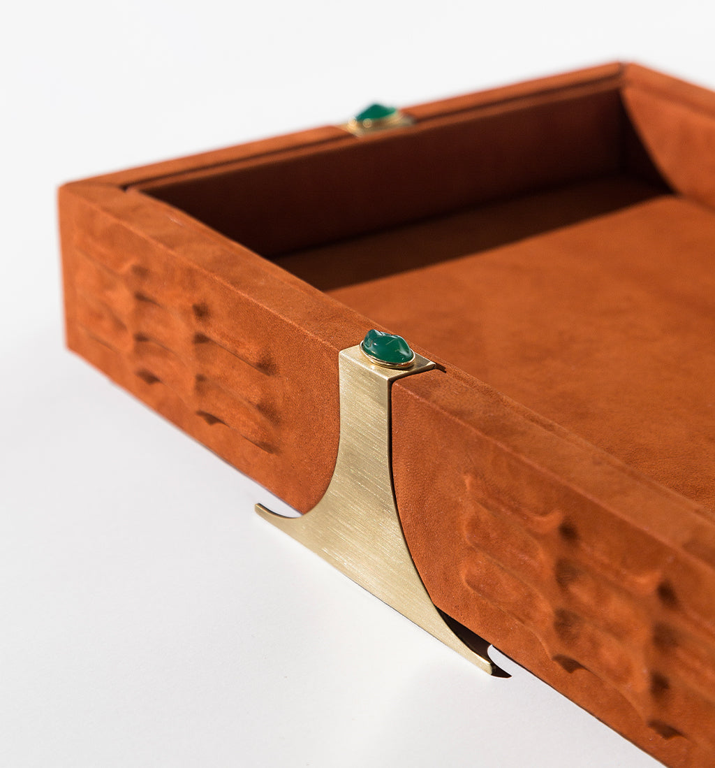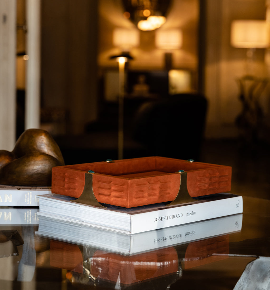 The solid wood structure (available in two sizes, square or rectangular) is totally wrapped in precious Nabuck, which also covers the inside of the tray. The texture that adorns the sides is highlighted by Brass supporting inserts, ultimate synthesis of inspiration.